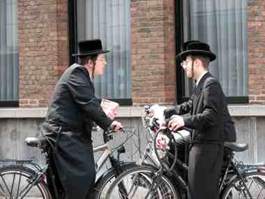 Widok Chasyda z rozwianymi na wietrze pejsami jadącego rowerem przez centrum nowoczesnego miasta to unikatowy widok, typowy jedynie dla Antwerpii