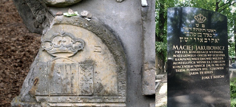 Oto symbol bardzo powszechny, często spotykany na macewach w Polsce. KORONA. Na pewno na każdym kirkucie, który odwiedzicie, natkniecie się na ten motyw. Oznacza on Torę, a szerzej – znajomość pism religijnych i pobożność. Przy koronie często znajduje się napis „Keter Szem Tow”, czyli „Korona dobrego imienia”. Jest to nawiązanie do cytatu z Pirke Awot, że „są trzy korony: korona Tory, korona kapłaństwa i korona królestwa, ale korona dobrego imienia jest ponad nimi.” (Pisząc to pomyślałem o szczycie Trzy Korony w Pieninach, ale to chyba przypadkowa zbieżność…) Przełożenie tego na prosty język ma wg mnie oznaczać, że dobre imię każdego z nas jest czymś szczególnie ważnym w życiu. Korona na macewach to więc znak, że zmarły był ceniony jako głowa rodziny lub gminy. „Biada nam, spadła korona z naszych głów”. Pozwoliłem sobie do tekstu dołączyć zdjęcie nagrobka osoby znanej i poważanej, patrioty i człowieka wyjątkowego (pochowanego w Krakowie), na którym to nagrobku znajdujemy napis w języku polskim, co – myślę – ułatwi zrozumienie sensu tego symbolu.