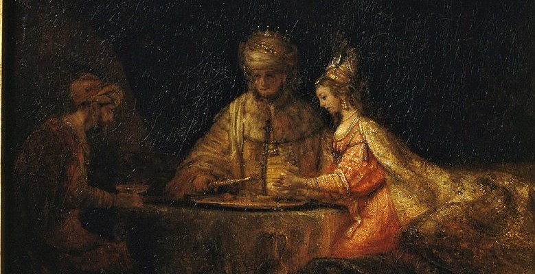 Ilustracja nad tytułem: „Achaszwerosz i Haman na uczcie Ester”, Rembrandt Harmenszoon van Rijn