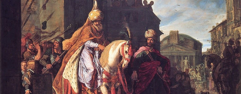 Ilustracja nad tytułem: „Triumf Mordechaja”, Pieter Lastman, 1624