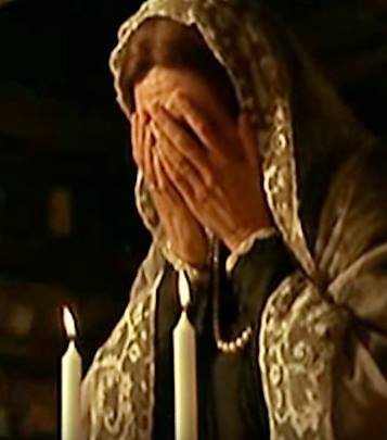 Po wygłoszeniu błogosławieństwa odkrywa oczy i spogląda na płomienie świec.