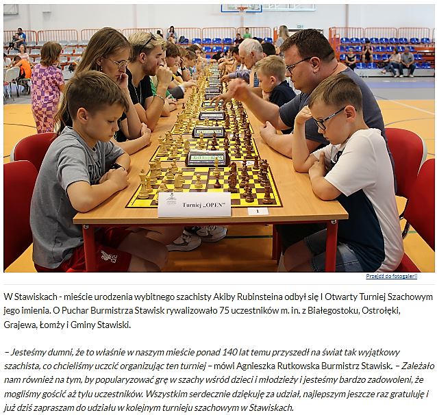 Niedawno w Stawiskach rozegrany został I Turniej Szachowy im. Akiby Rubinsteina o puchar Burmistrza Stawisk https://www.stawiski.pl/index.php?wiad=2293 .