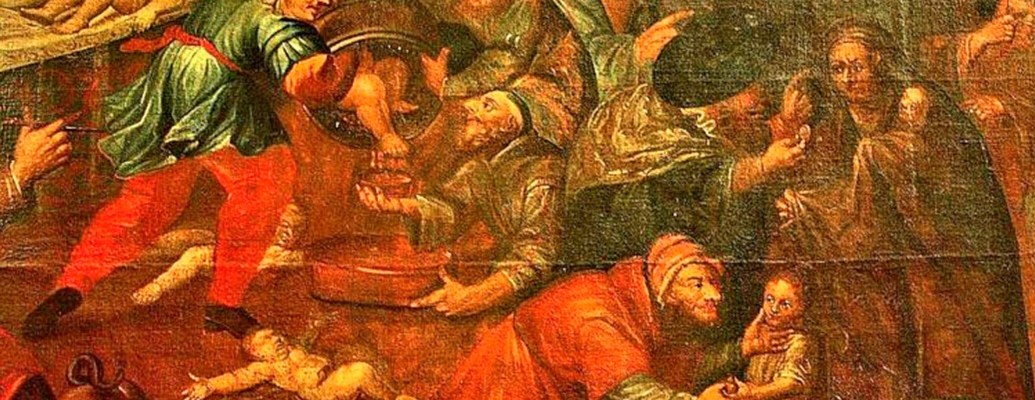 „Obraz ten przedstawia rzekomy mord rytualny, który miałby być dokonany przez sandomierskich Żydów w celu dodania krwi dziecka chrześcijańskiego do macy używanej w czasie Paschy. Wydarzenie to nie jest zgodne z prawdą historyczną, a co więcej nigdy nie mogło mieć miejsca, gdyż prawa judaizmu zabraniają spożywania krwi. (…)”.